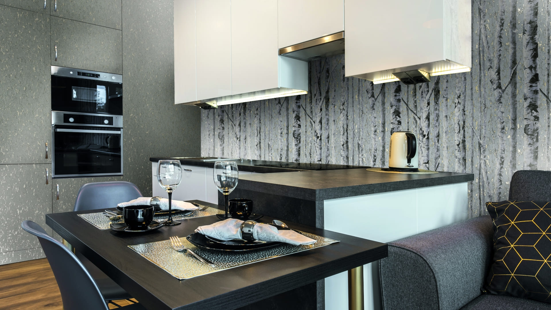Moderne et originale, la cuisine CRYSTAL est réalisée dans un matériau (MDF) permettant d’en réduire l’épaisseur jusqu’à 12 mm. Elle est habillée de façades, ultra brillantes de coloris blanc avec un effet verre et un décor bois graphite brossé argent. De plus, elle vous offre un décalage original de volumes, du linéaire où se concentrent l’évier et la plaque de cuisson.